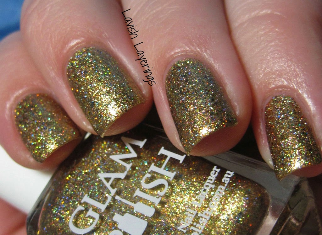 Sorcerer's Apprentice has a holographic base with ultra holo glitter, golden/green flakies, iridescent color shifting glass flecks and shimmer. This one has a deeper, more bronzy gold base than Deceptive Practice. The color shift is very subtle in this, but it has sort of a gold to bronzy/green tinge. This was 2 easy coats.