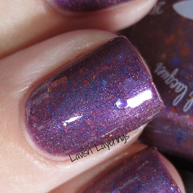 A Real Slice is a deep orchid purple crelly with color shifting glitter and flakes, a pink/gold shift, and holographic sparkle. Formula spread smoothly and easily and I used 3 thin coats for full coverage. This polish has a lot of gorgeousness going on, but it tended to get drowned out in photos because of the strong shimmer. I love the pops of blue from the color shifting glitters...so pretty! This polish is inspired by Megara from the Movie Hercules! A Real Slice will also retail for $11.