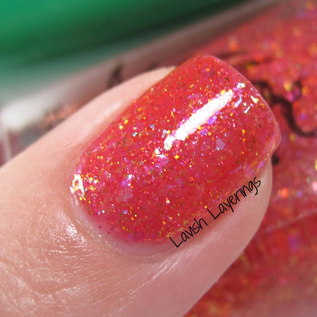 Shell Yeah! is a bright coral jelly filled with gold, pink, and green iridescent color-shifting flakies, aurora shimmer, and scattered holo microglitters. Formula spreads smoothly and easily and starts off sheer, but builds up nicely to squishy opacity in 3 thin coats. This is such a juicy, watermelony shade for summer! I adore the variety of flakes in here with the cool and warm tones.